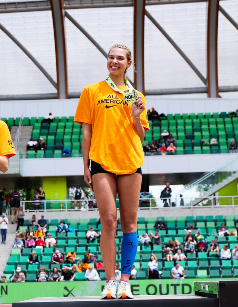 Katie’s 2025 high school season resulted in a 1st Place High Jump win at the Illinois 2A State Championship and a new school record. She went on to compete at Nike Nationals, where she earned the title of All American, a silver medal and a personal best of 5’9¼”.